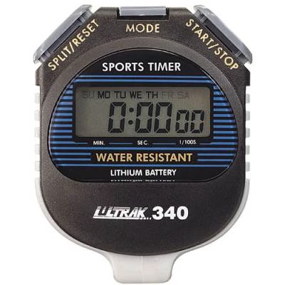 As a coach, official or trainer, you need a stopwatch; and this Ultrak 340 Stopwatch is the one you’ll want this year. Loaded with extras, the Ultrak 340 has a large numerical display. Time, calendar and daily alarm. Measures to 24 hours. Displays cumulative splits. Water-resistant. Comes with lithium battery and handy lanyard. If you’re involved in track, swimming or other timed sports, you can count on the Ultrak 340 Stopwatch.