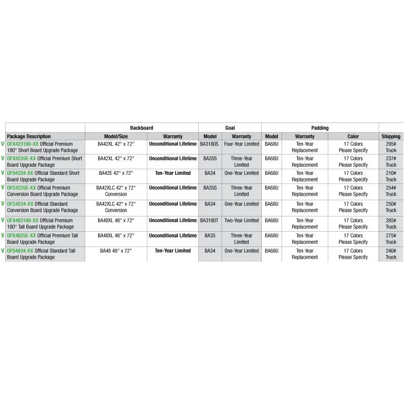 - Standard upgrade package includes BA42XLC unconditional lifetime warranty conversion backboard, BA34 breakaway goal and BA68U backboard padding in your choice of colors