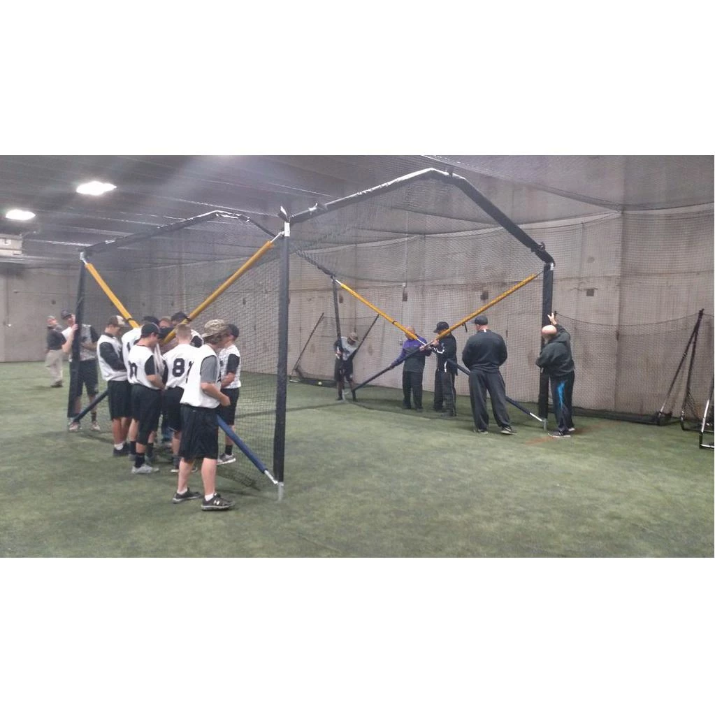 - Designed to be used in a gymnasium, field house or outdoors on the field. Open the cage up to its full size, buckle the crossbar supports, maneuver to wherever the cage is needed on the field (or at home plate), lock into place and you’re ready to start hitting!