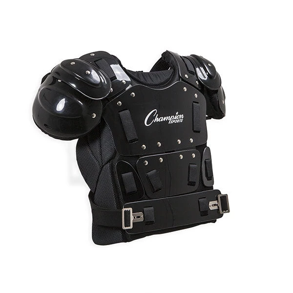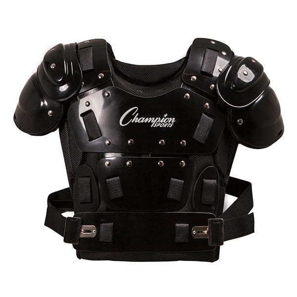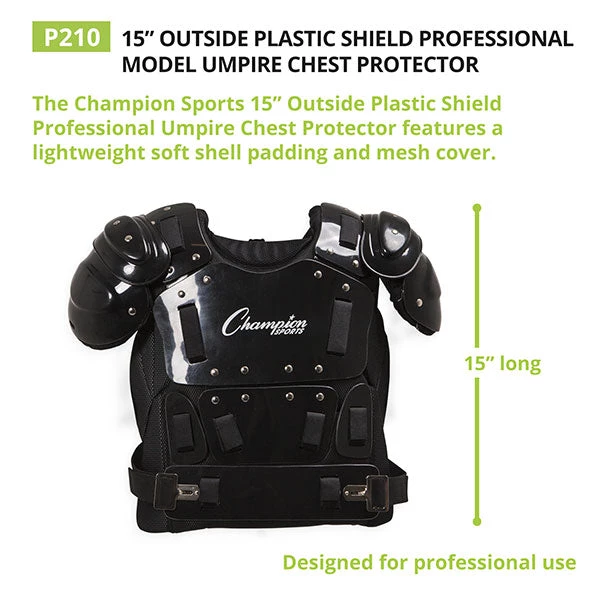 Designed to maximize comfort and agility, the Champion Sports 15 Inch Outside Plastic Shield Professional Umpire Chest Protector features a lightweight soft shell padding and mesh cover for exceptional breathability. With extra-wide side coverage and shoulder caps, this umpire chest shield ensures maximum protection against wild pitches and foul balls. With a hardened plastic shield, this chest protector is fit for amateur or professional use.