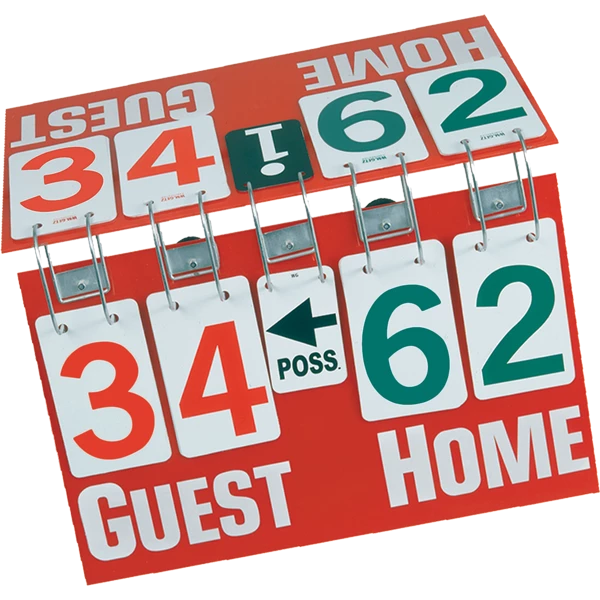 Keep track of the game with the Champion Sports Deluxe Tabletop Scorer. This all-purpose scorer features non-tearing white plastic numbers on a heavy plastic board, with a center possession indicator. Extra suction cups keep this scorer in place!