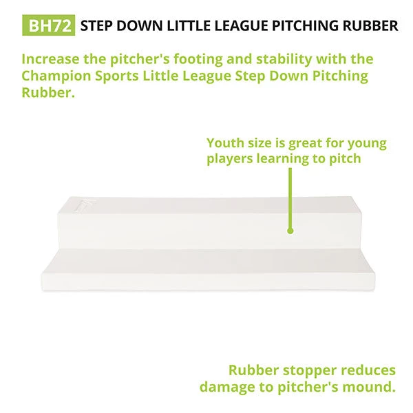 Increase the pitcher’s footing and stability with the Champion Sports Youth Step Down Pitching Rubber. A perfect addition to any baseball diamond, this youth pitching rubber features a heavy-duty rubber stopper that reduces damage to the pitching mound, minimizing maintenance. Additionally, the youth size is great for young players learning to pitch.