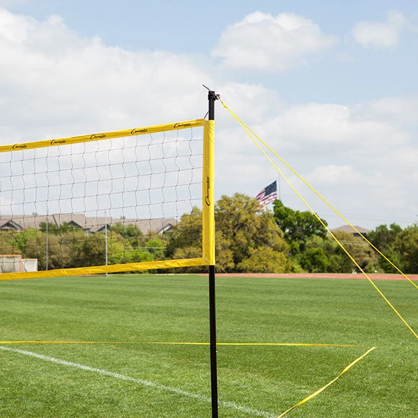Set up your next volleyball tournament in a flash with this Champion Sports Tournament Series Volleyball Set. Designed to last, the durable powder-coated aluminum poles are strong enough to endure even the most intense smashes. The high-quality mesh net features waterproof tarpaulin tapes to help it stand up to the elements outdoors. The volleyball set contains everything you need to start playing, including a premium quality volleyball and pump to keep it inflated between matches. The whole set also packs away neatly into a weather-resistant carrying case for easy transportation and storage.
