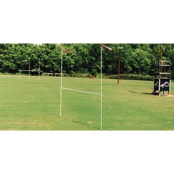 Easily installed and removed. Ideal for practice facilities. Includes ground sleeves and wind streamers 2 inch outside dimension galvanized steel. 10 feet high uprights 20 feet high from ground. High School Goal: 23’4″W.