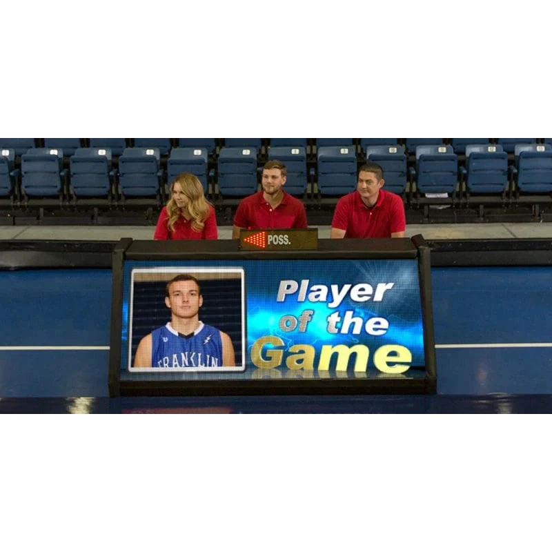 Varsity Scoreboards’ Video Scorer’s Tables are carefully designed to allow a single person to move and position the unit, and only requires plugging into common 110v power and a single HDMI video source. The Video Scorer’s Table can run with or without a live operator! All Video Scorer’s Tables include a control center pre-loaded with presentation software to generate video introductions, team rosters, player profiles, animations, and advertising banners!