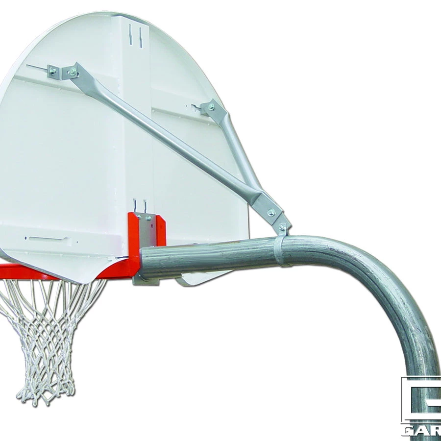 Designed to complement playground basketball courts, the GN45R 4-1/2″ O.D. gooseneck basketball post with 4′ extension arm provides support for backboard and rim weighing up to 100 pounds combined. Post has a traditional curved design with a fixed height. Extension arm provides a 48″ safe play distance and includes a V-brace to connect to board to reduce vibration. This post is only compatible with rear-mount fan-shape steel backboards.