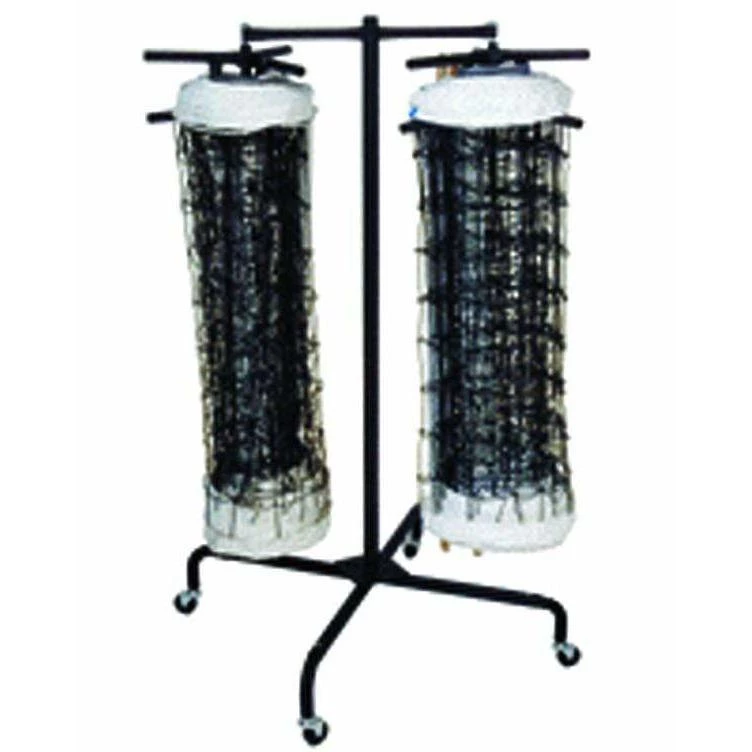 The store-it double net storage rack is a freestanding movable trolley which easily and neatly stores two volleyball nets while using minimal floor space. The 9940 is constructed of steel with a black powdercoat finish for long-lasting durability. Non-marring castors protect floors and allow multi-directional movement of unit.