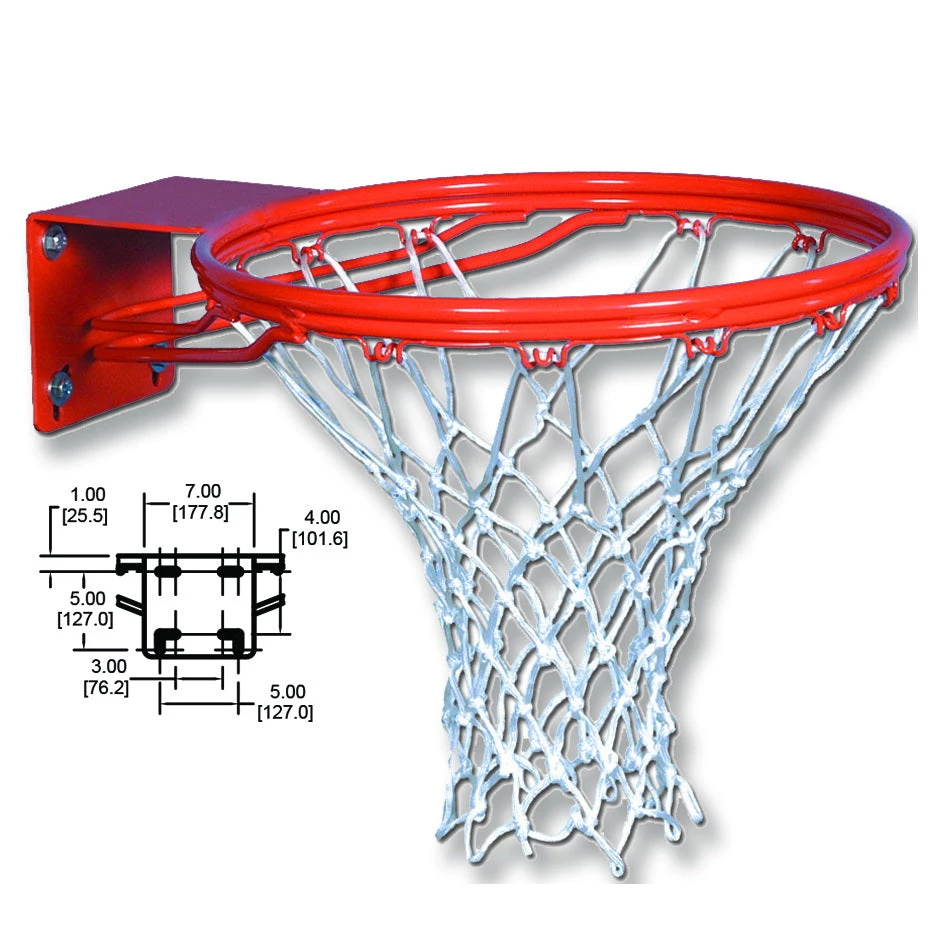 Understanding the anatomy of a front-mount fixed rim is the first step in choosing the correct fit for side courts or outdoor playground courts. A fixed rim is comprised of four basic components: ring, bracing, net attachment and back-plate. As you add rings, ring diameter, and strengthen bracing, a stronger rim is built. Most fixed goals are double-ringed rims, with various levels of bracing. All rims feature universal backplates for a variety of backboard/rim combinations and ship with an outdoor quality net. While our fixed goals feature universal hole patterns, we do not recommend installing fixed goals on glass backboards as it increases the chance of board breakage.