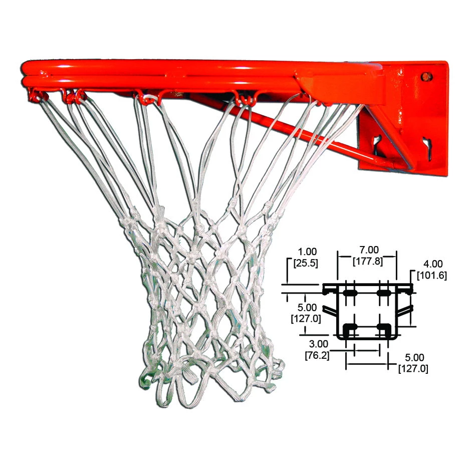 Understanding the anatomy of a front-mount fixed rim is the first step in choosing the correct fit for side courts or outdoor playground courts. A fixed rim is comprised of four basic components: ring, bracing, net attachment and back-plate. As you add rings, ring diameter, and strengthen bracing, a stronger rim is built. Most fixed goals are double-ringed rims, with various levels of bracing. All rims feature universal backplates for a variety of backboard/rim combinations and ship with an outdoor quality net. While our fixed goals feature universal hole patterns, we do not recommend installing fixed goals on glass backboards as it increases the chance of board breakage.