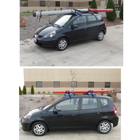 The HandiRack™ inflatable roof rack is an economical alternative to installing a permanent after market roof rack. The HandiRack™ installs and breaks down in minutes. This is a temporary load carrying system and should not remain fitted to the vehicle when not in use. The HandiRack™ can be used to transport vaulting poles and javelin tubes. The max load of the HandiRack™ is 180 lbs. Consult your vehicle’s owner’s manual for the max roof load of your vehicle.
