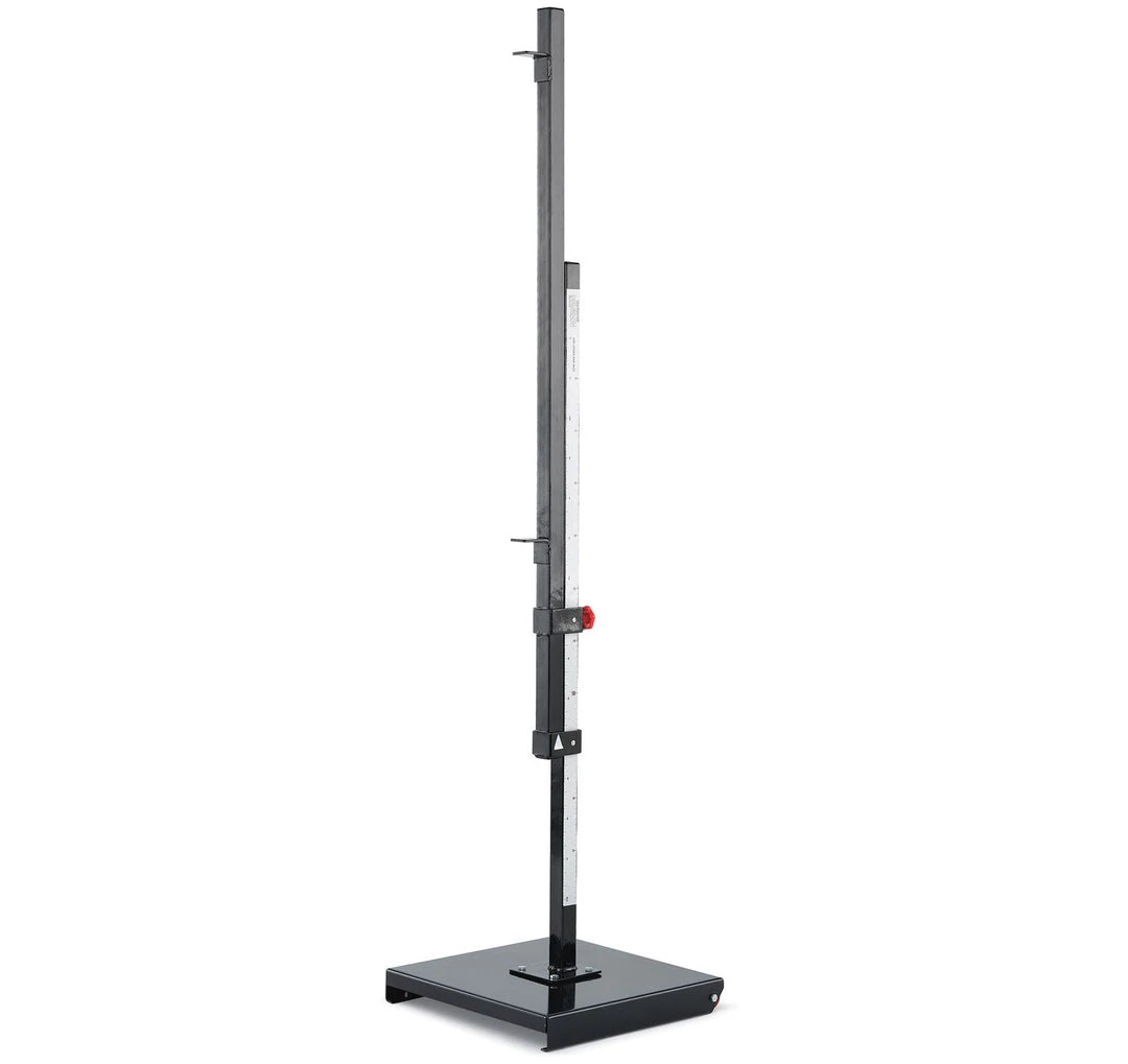 All steel construction with black powder coat finish. 18″ square base includes wheels for easy mobility. Height scales read both English and Metric from 2′ to 8′.