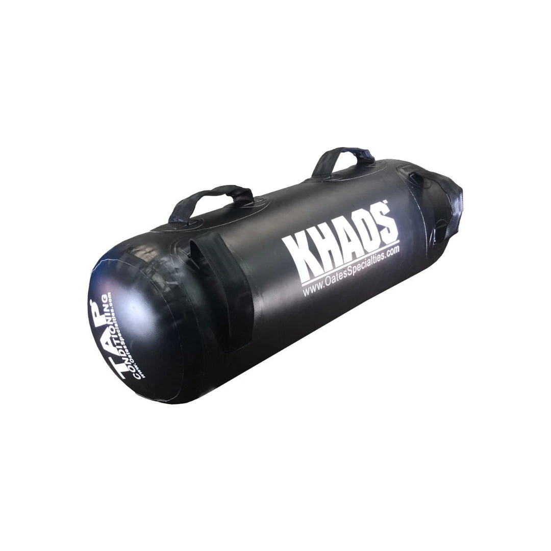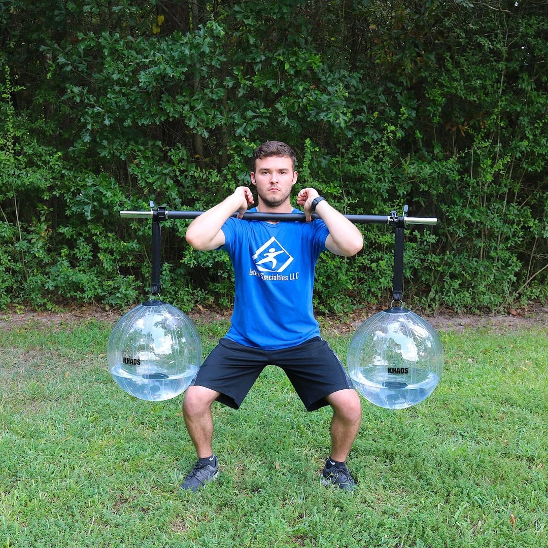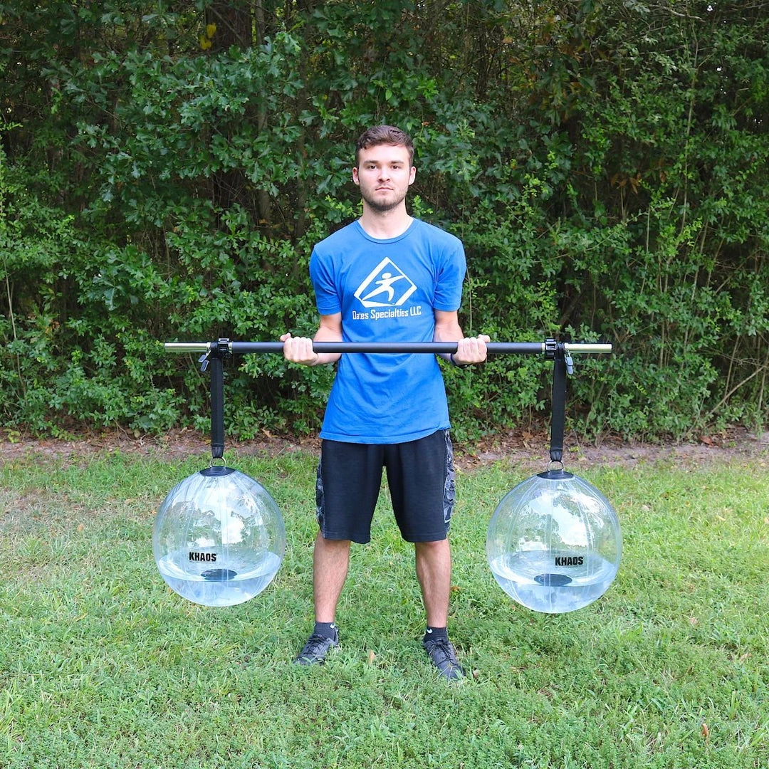 Because of the additional balance and stability requirements, the weight required to challenge an athlete is less than the amount needed in traditional resistance training. The weight of the Khaos® Waterboy can be altered simply by adding or removing water until the desired weight is achieved; the balance of the device volume is filled with compressed air. (Less water makes the device more unstable). Many exercises performed with a traditional barbell or dumbbell can be performed with the Khaos® Waterboy.