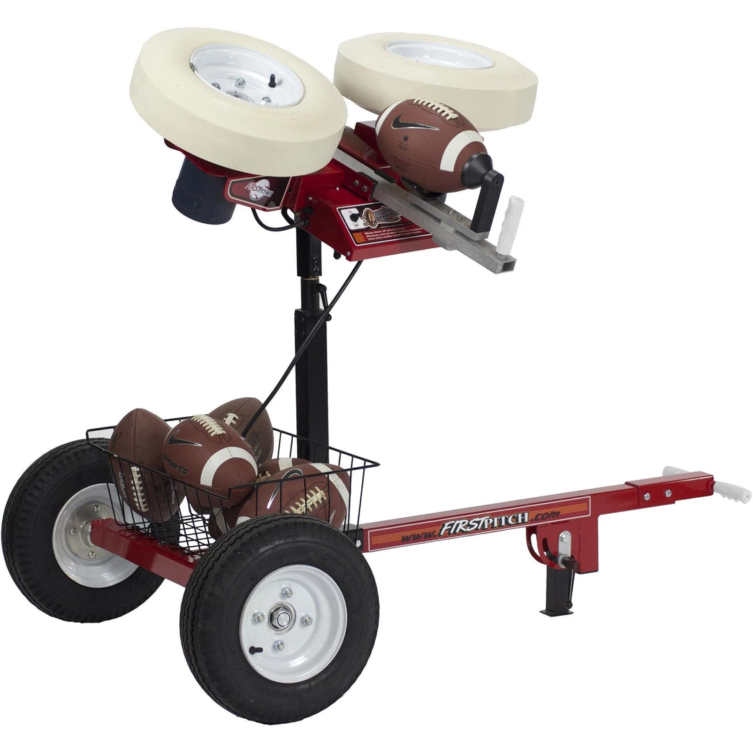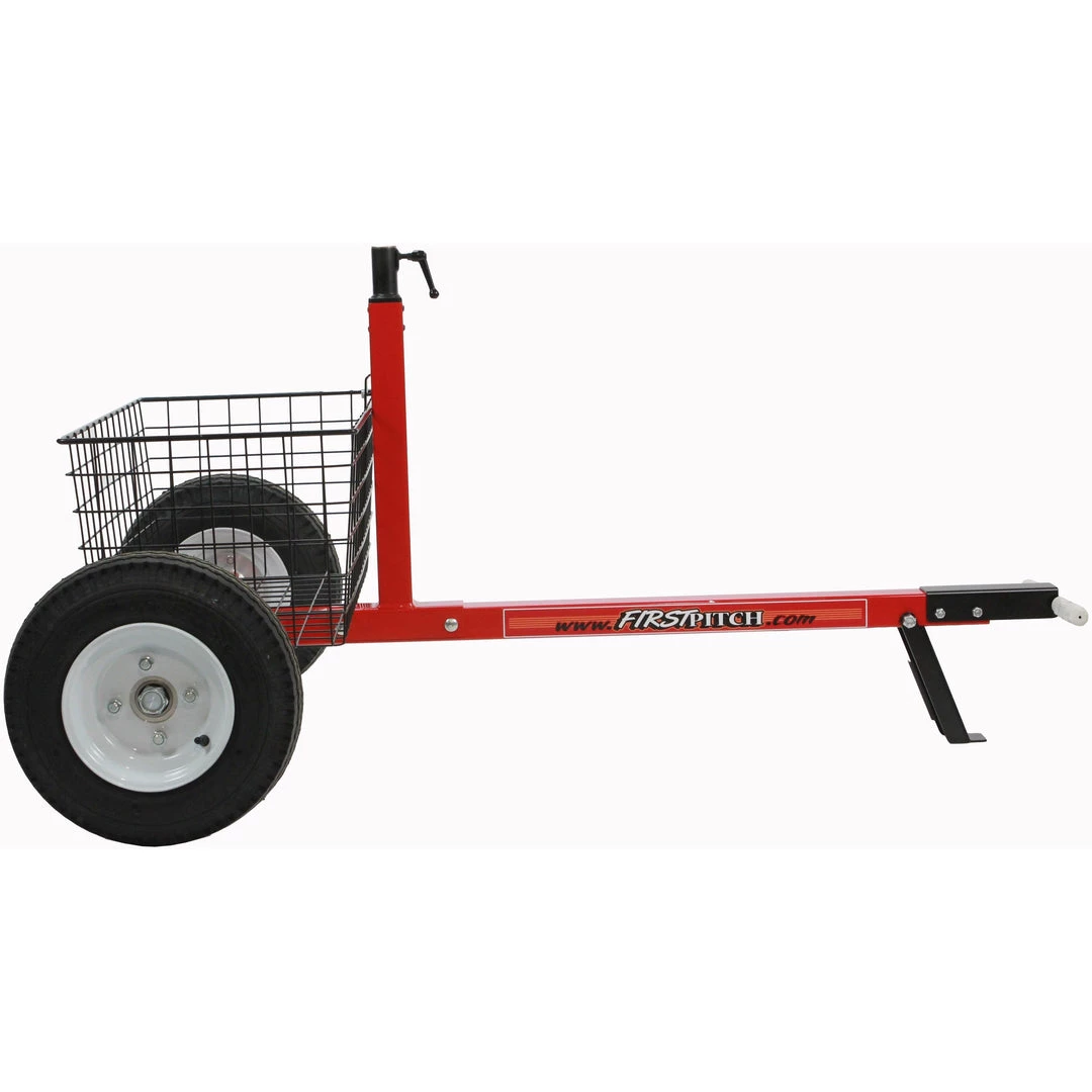The Transporter Pro features large wheels for any terrain and can be pulled by hand, or hooked up to gulf cart, lawn tractor, or ATV. The large basket allows you to carry footballs, baseballs, or other equipment. Trailer hitch ball size is 1 7/8″.