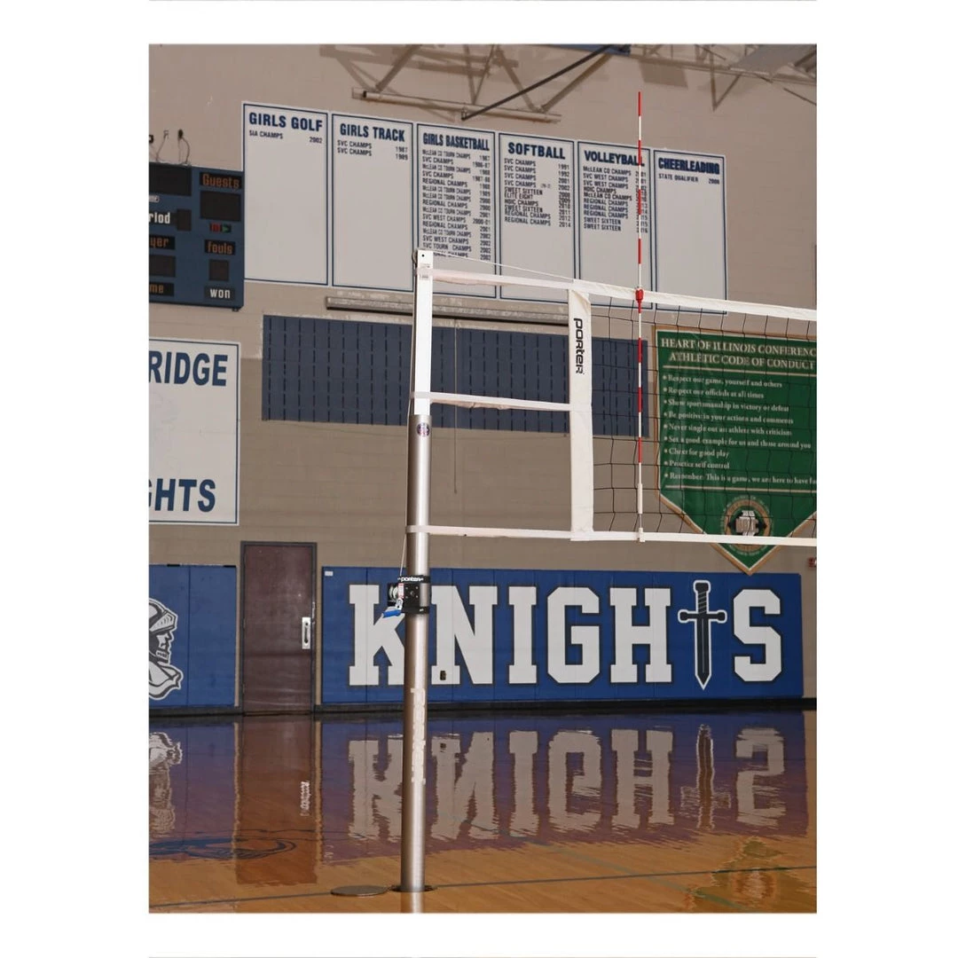 Powr-Line standards are engineered and manufactured to meet the exacting demands of championship play with maximum safety. Constructed of high strength, lightweight aluminum, the standards offer quick set-up and easy storage. Net heights adjust from Olympic competition to elementary height settings as specified by the FIVB, NFHS and the USAV. Volleyball net and floor sleeves not included with standards.