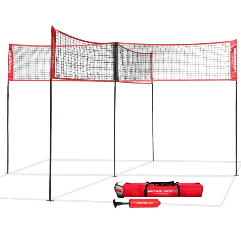 This fun, new game is sure to be the hit of your outdoor gathering! The PowerNet Four-Square Volleyball Game combines two sports to make for one awesome time. Includes net, boundaries, lines, stakes, volleyball, pump and carry bag.