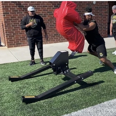 The Climb sled was designed to allow offensive and defensive linemen a realistic game like target to combat linemen who play “low and long”, leaving little surface area to strike the opponent. With DL’s offering little surface area to strike, the offensive lineman must learn the new “Climb” technique; by striking underneath the shoulder plate with an upper cut strike, while finding “handles” on the breast plate of the defender.