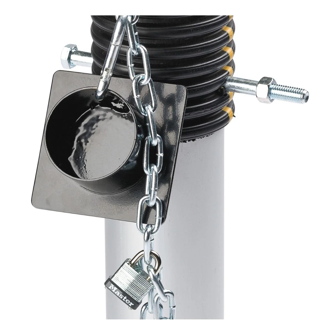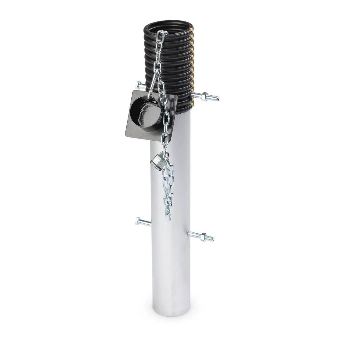 A ground sleeve option for securing portable goals in turf fields. Featuring a small 4 1/2″ footprint and a flexible top that compresses with surrounding turf on impact. Chain link wraps anchor pin inside ground sleeve and rear spreader tube on surface to secure goal in place. Padlocks included. Cap may be covered with turf for uniform appearance.