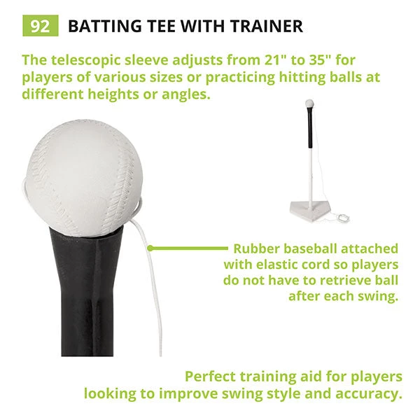 Designed to help batter’s improve their swing, the Champion Sports Batting Tee With Trainer features a rubber ball attached with an elastic cord so players don’t have to retrieve each ball they hit as they practice. The telescopic sleeve adjusts from 21″ to 35″ for players of various sizes or practicing hitting balls at different heights or angles. The ball can be removed so that the batting tee can be used for games.