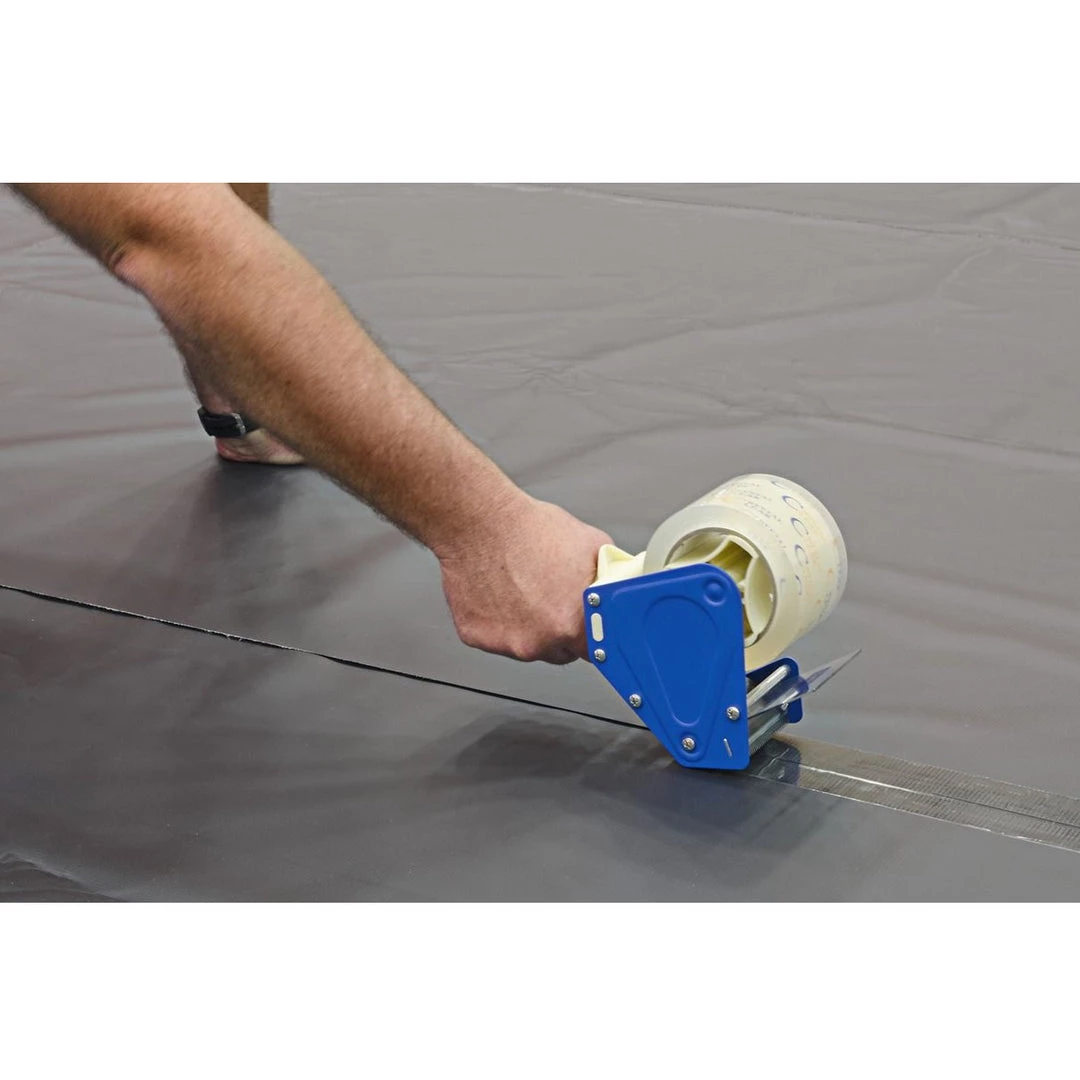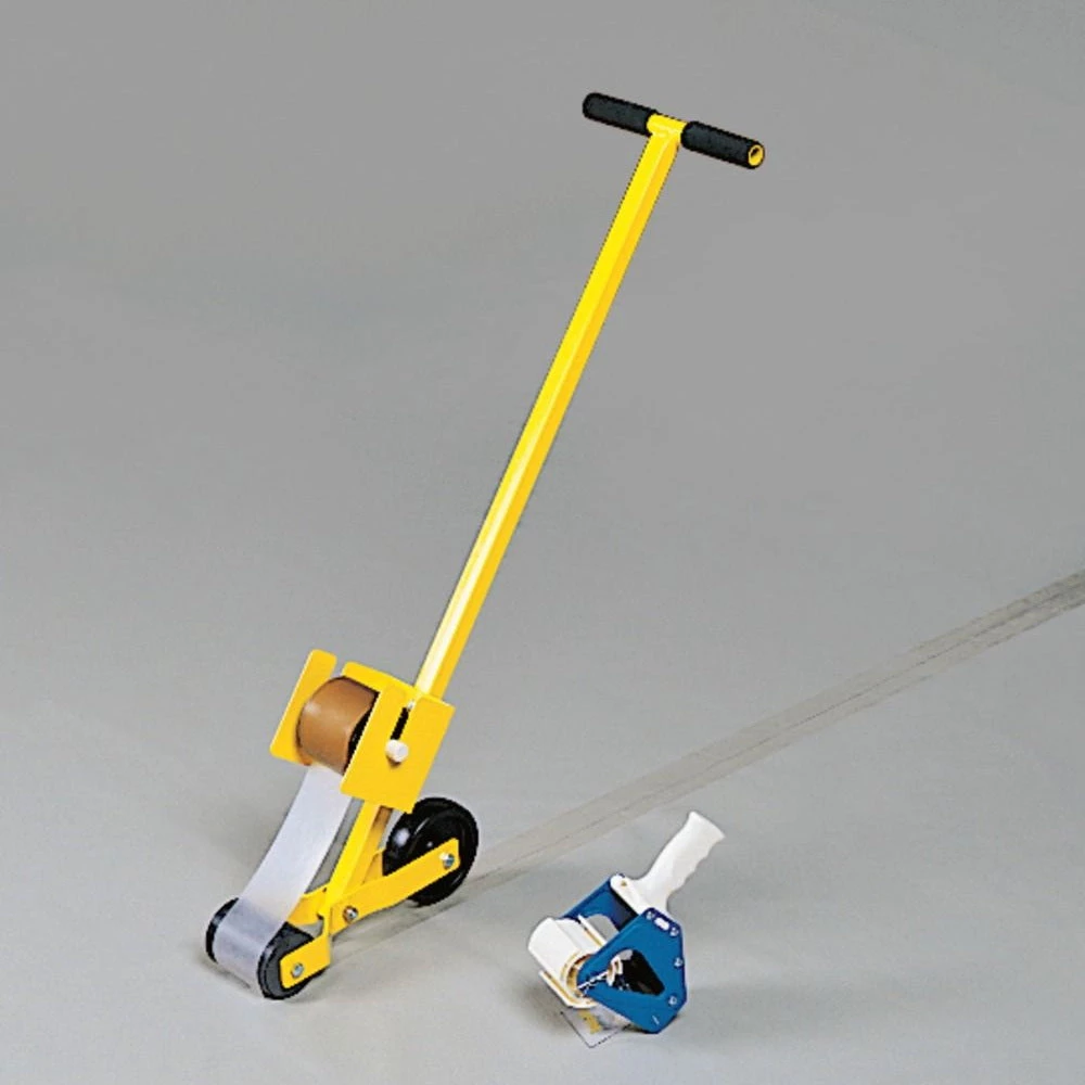 Handheld and walking tape applicators for securing vinyl floor covering sections together. Floor cover seam tape comes in cases of 12.
