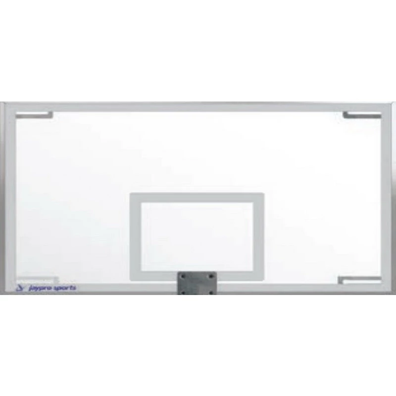 1/2″ thick tempered glass backboard designed for impact load on goal to transfer directly to a lower reinforced steel frame member without putting stress on glass.Â