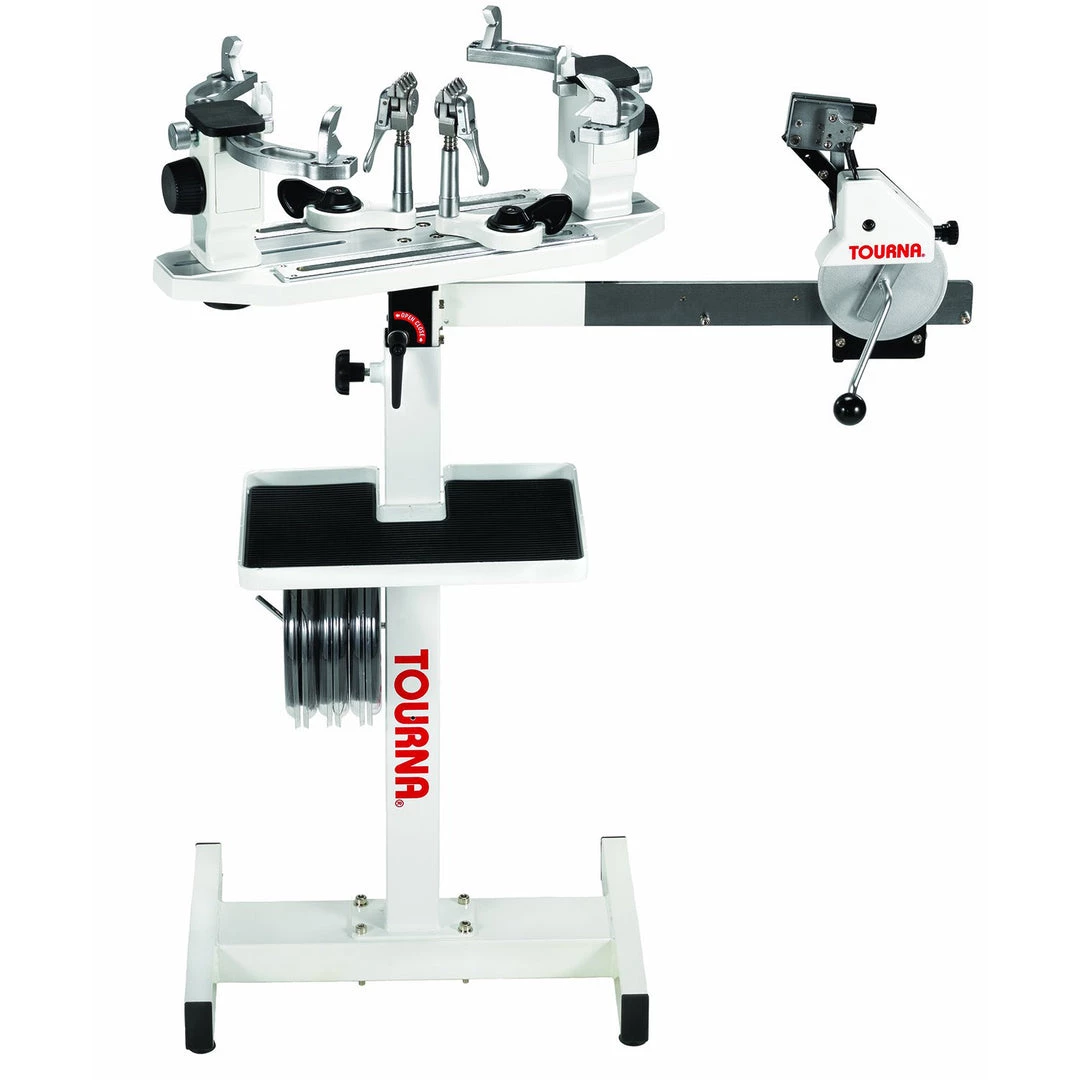 The manual crank mechanism features a spring loaded tension winder that has scale increments of pounds and kilograms. The Tourna 300-SC also comes equipped with articulated side stabilizing arms for convenience.Â